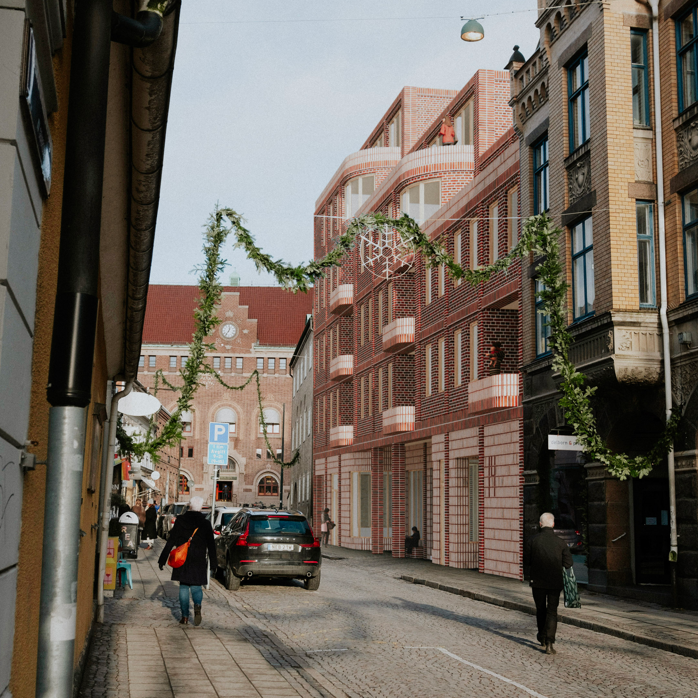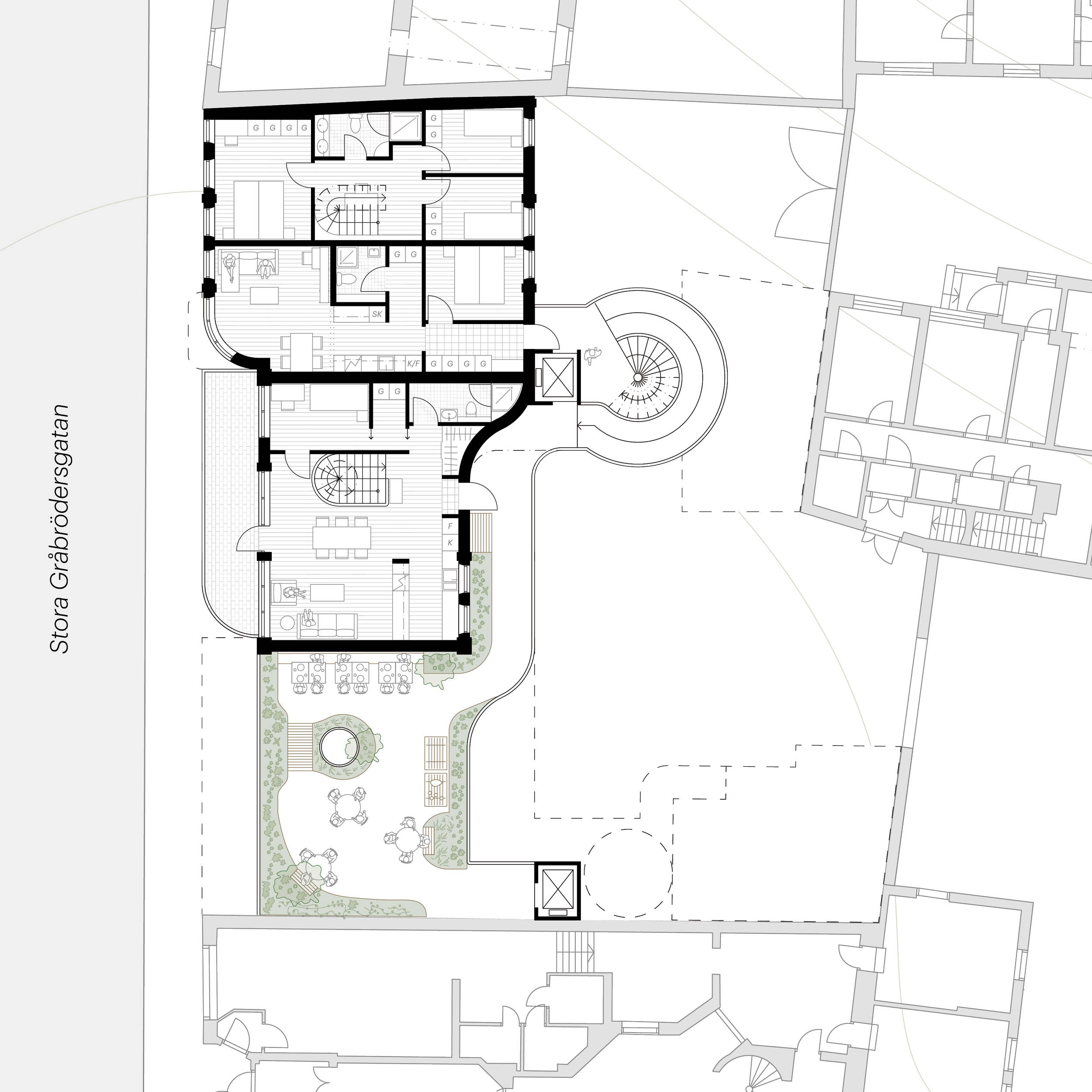 Altona Trio är placerad mitt i centrala Lund, omgivet av byggnader från 1600- till tidigt 1900-tal. En del av siten är i hörnet vid Juridikum och den andra längre ner på Stora Gråbrödersgatan. Den norra delen av tomten görs om till en liten park där studenter och förbipasserande kan pausa för en kaffe från den lilla kiosken eller ett parti schack vid stenborden — en grön yta som alla kan använda. På den södra delen föreslår vi ett flerbostadshus med butiker i bottenvåningen. En liten gångväg kopplar samman de två delarna och skapar en ‘hemlig’, alternativ väg i staden.
