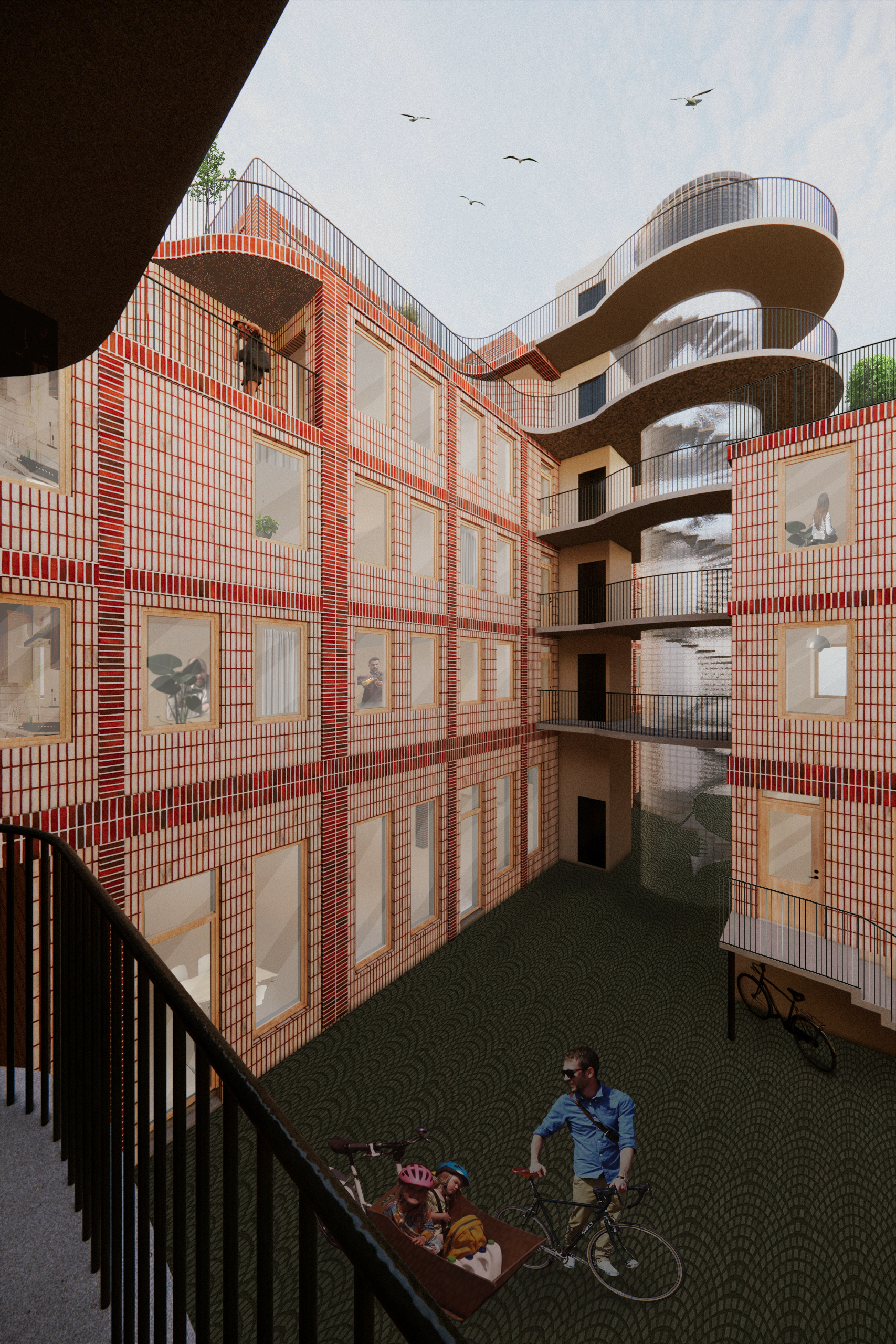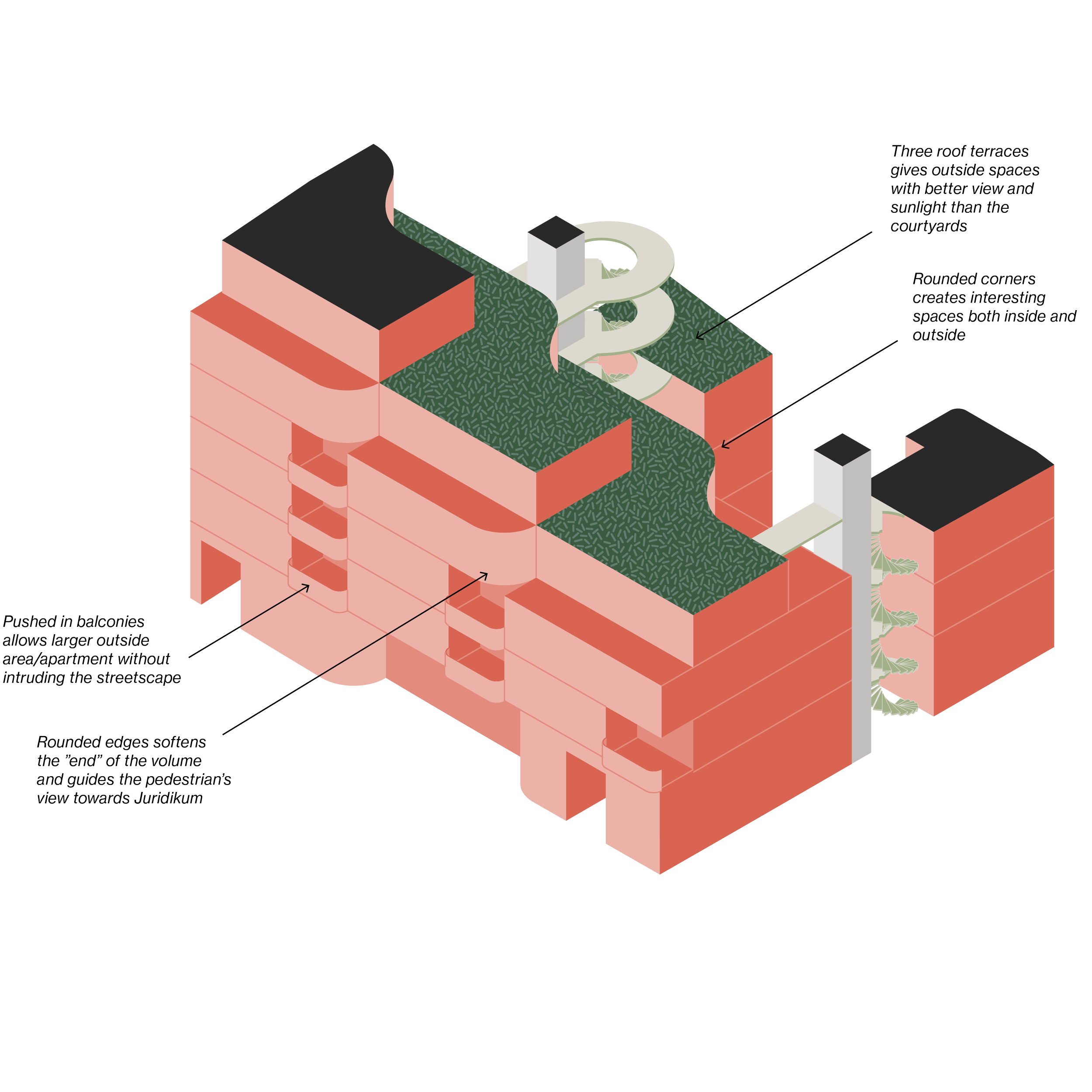 Huvudbyggnaden är indelad i tre volymer med de översta våningarna indragna för att ta ner skalan och därmed få den att smälta in i det existerande gatulandskapet bättre. Fasadmaterialet är återbrukat tegel där bottenvåningens utgörs av ljusa tegelstenar i stående stapelförband med röd fog för att kontrastera mot de övre våningarnas röda tegelstenar i kryssförband med vit fog. De horisontella och vertikala indelningarna är något utskjutna vilket skapar ett djup i fasaden. Den vertikala kommunikationen består av två trapphus med väggar i glasblock som skyddar mot väder och vind och släpper in ljus på vägen upp. Tre takterasser skapar gröna ytor och plats för att umgås.