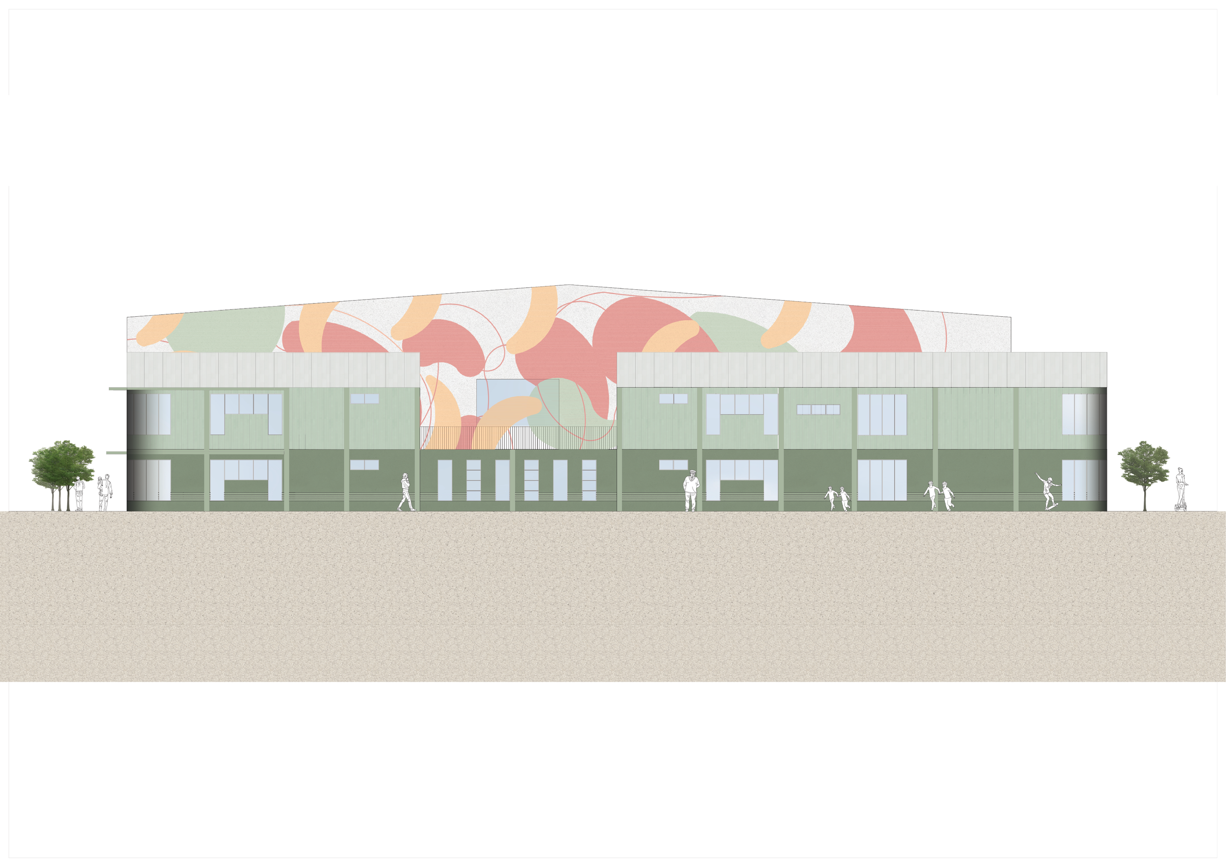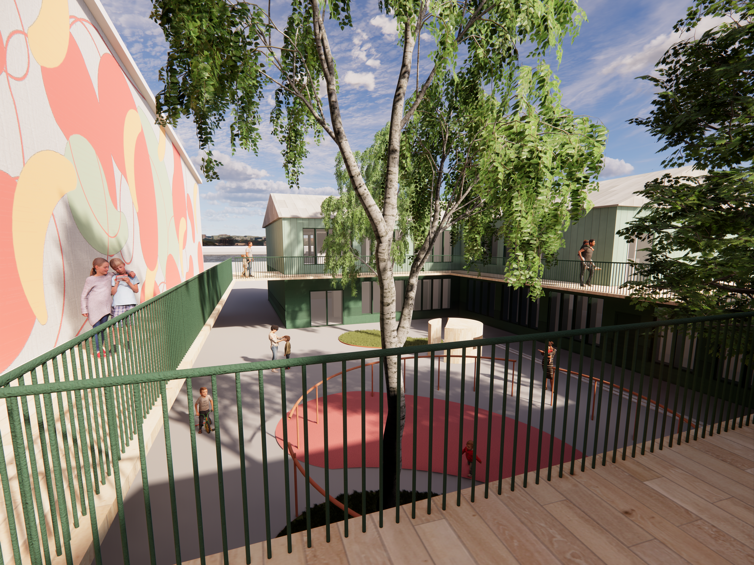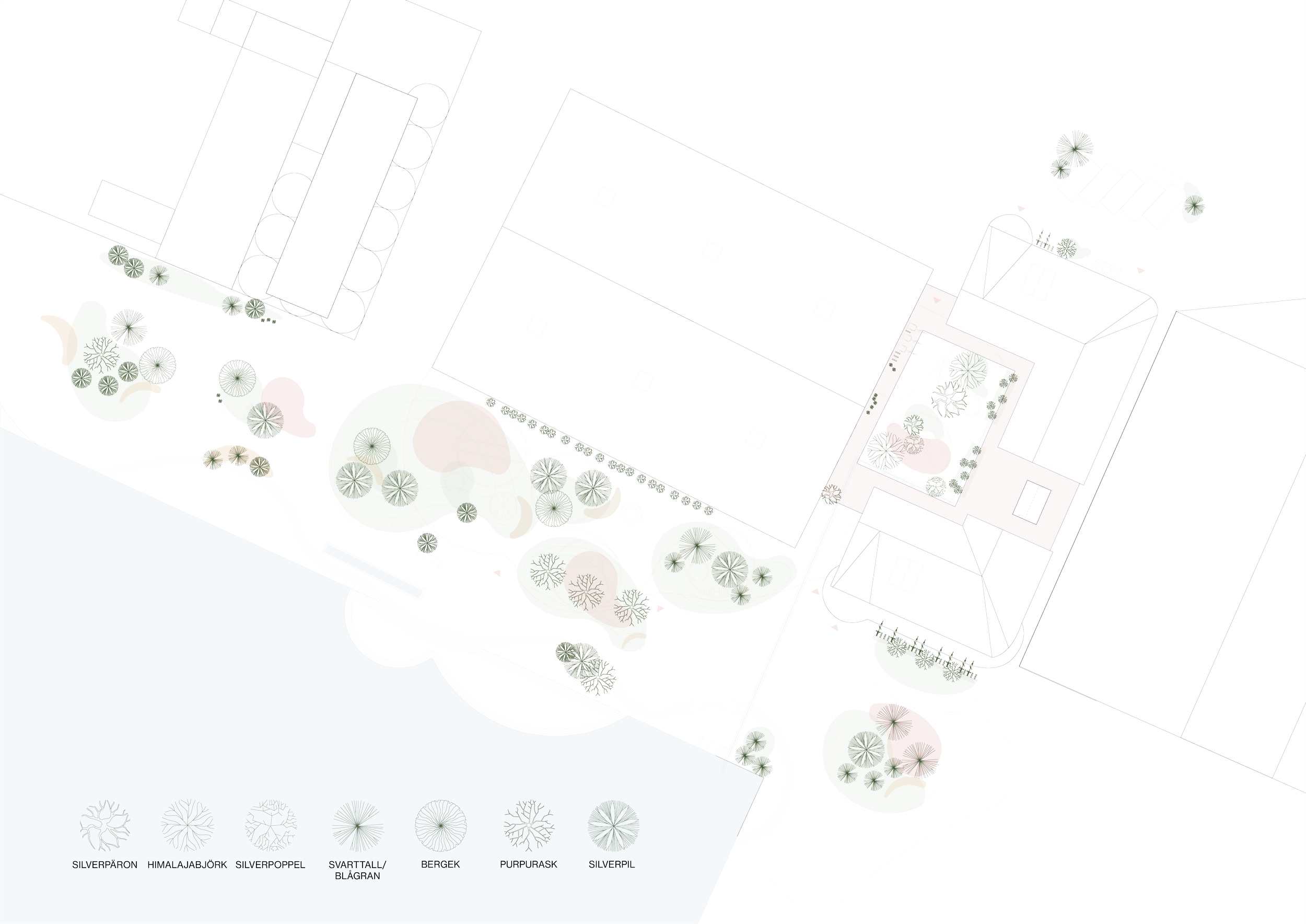 Med detta förslag ville vi introducera vegetation, aktivitet och tillgänglighet till en idag väldigt hård och otillgänglig plats. Vi ville även få ner skalan till barnens nivå genom att arbeta med färg, rum i rum och fönster i barnhöjd. Ledorden i gestaltningen var en lekfull utomhusmiljö som gynnar både lek och lär, t ex utomhusverkstad, möjligheter att äta och sova ute och vattenlek. Efter intervju med förskolepedagog fick vi många värdefulla tips som vi sedan tog vidare i gestaltningen: fönster mellan skötrum och grupprum, god uppsikt inifrån ut till vagnparkering där barnen kan sova, fasta möbler som delar upp rummen, sittplats i foajén för att inte stressa kring av- och påklädning, vinkzon för att underlätta vid hämtning och lämning och odlingsmöjligheter både inomhus och utomhus.