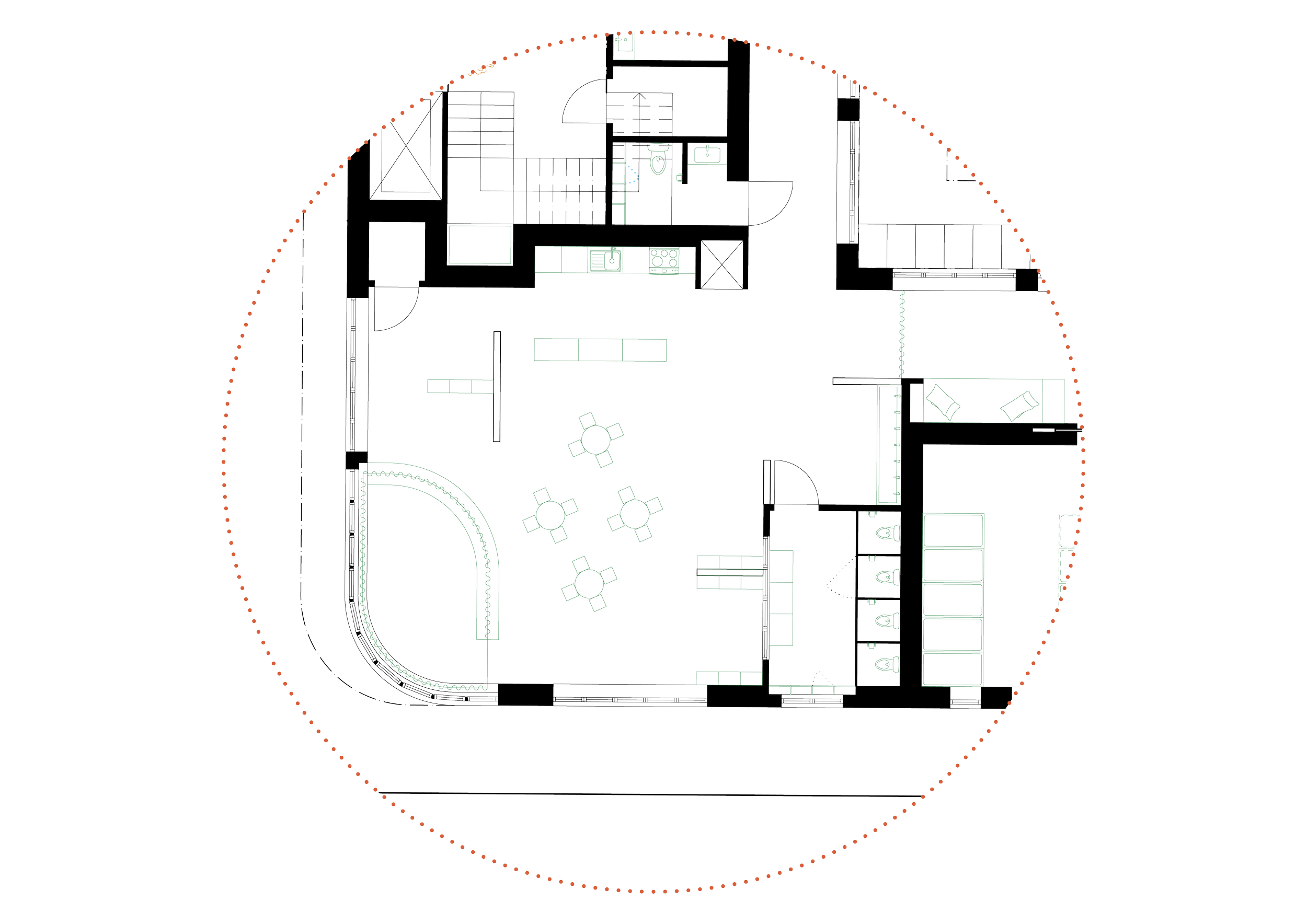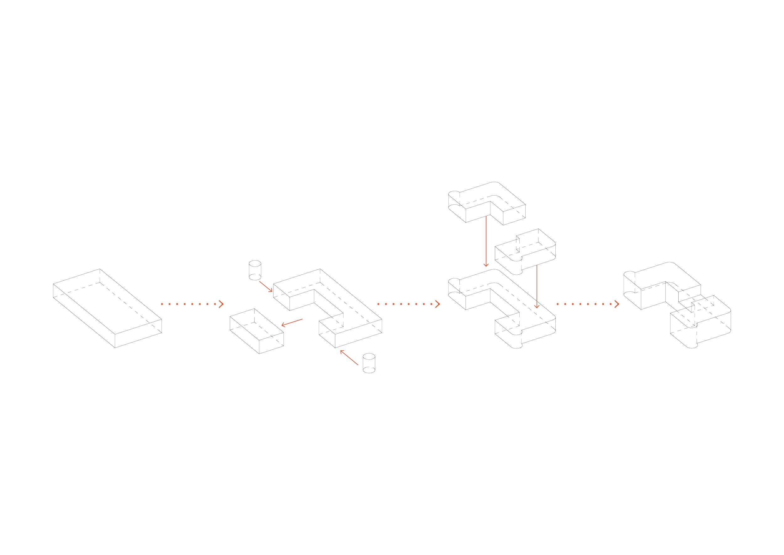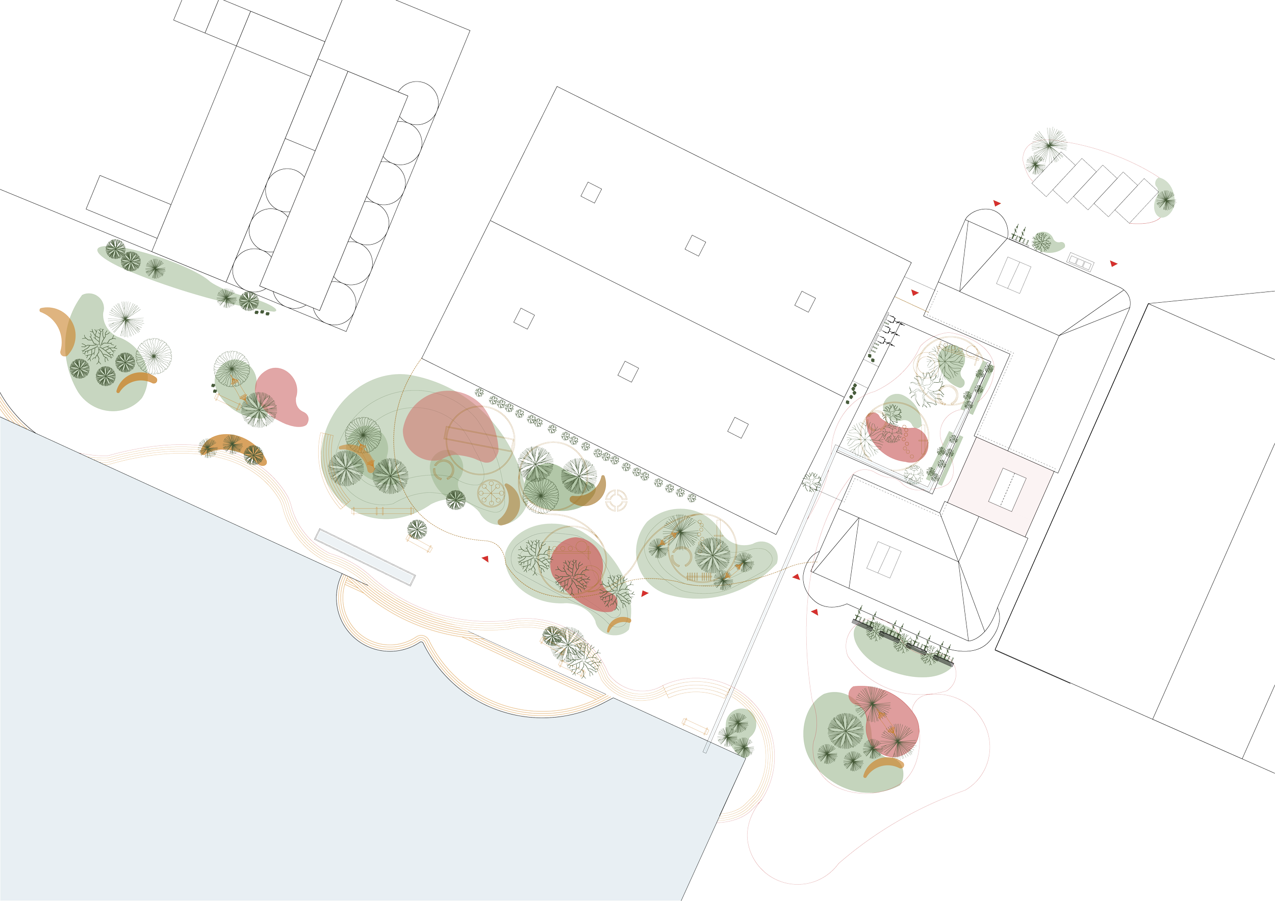 Med detta förslag ville vi introducera vegetation, aktivitet och tillgänglighet till en idag väldigt hård och otillgänglig plats. Vi ville även få ner skalan till barnens nivå genom att arbeta med färg, rum i rum och fönster i barnhöjd. Ledorden i gestaltningen var en lekfull utomhusmiljö som gynnar både lek och lär, t ex utomhusverkstad, möjligheter att äta och sova ute och vattenlek. Efter intervju med förskolepedagog fick vi många värdefulla tips som vi sedan tog vidare i gestaltningen: fönster mellan skötrum och grupprum, god uppsikt inifrån ut till vagnparkering där barnen kan sova, fasta möbler som delar upp rummen, sittplats i foajén för att inte stressa kring av- och påklädning, vinkzon för att underlätta vid hämtning och lämning och odlingsmöjligheter både inomhus och utomhus.