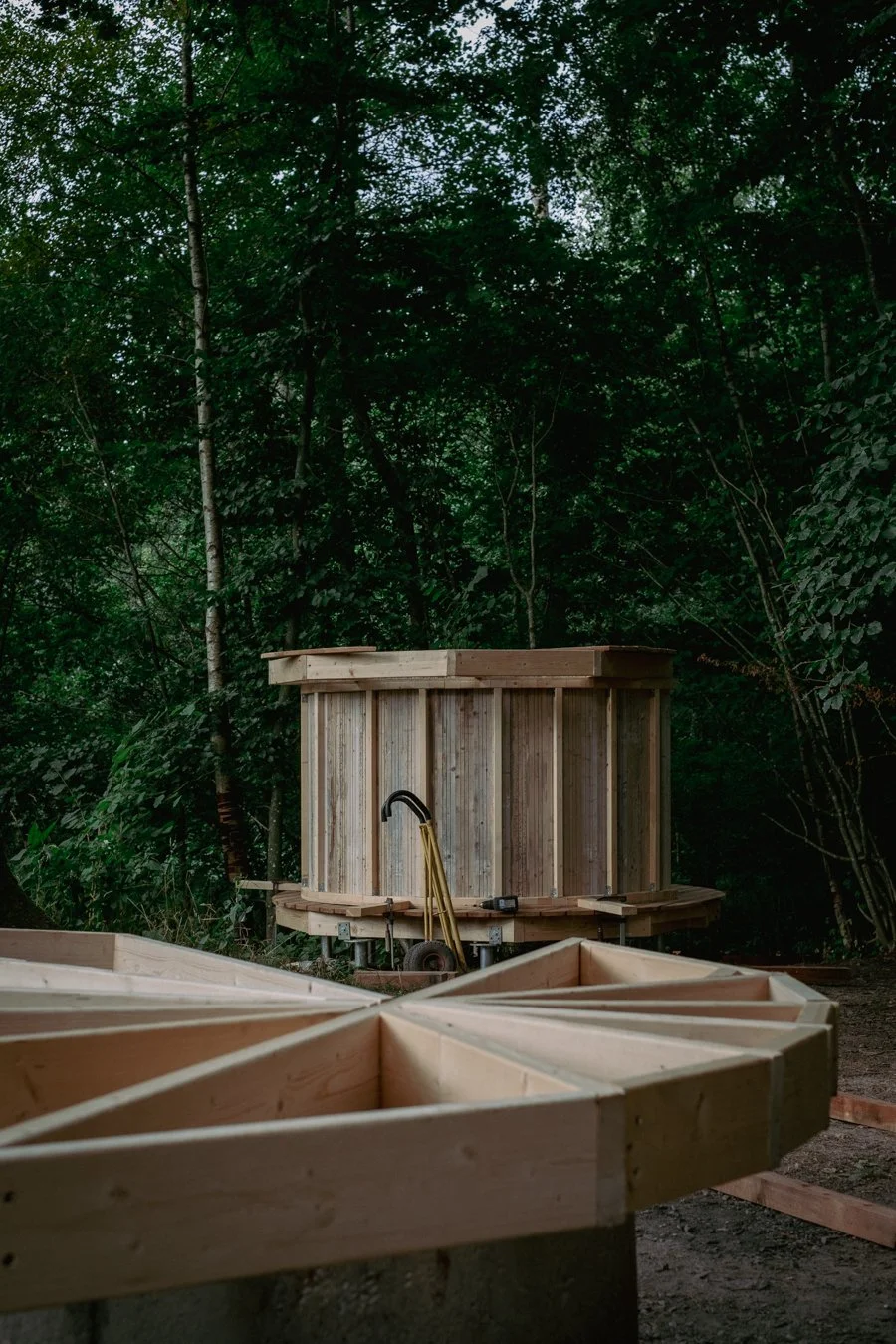 Vindskyddet är byggt i trä, där bladens stjälkar och stomme består av kärnvirke av gran och lärk. I den yttre fasaden ligger plankorna omlott för att ge en organisk känsla. Näckrosen är en lekfull tolkning av vad en upplevelse i naturen kan vara.